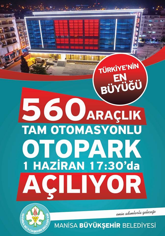 Türkiye’nin en büyük tam otomasyonlu otoparkını Manisa’ya kazandıran Manisa Büyükşehir Belediyesi, dev projeyi 1 Haziran Çarşamba günü, saat 17.30’da düzenlenecek törenle hizmete açacak. Manisa merkezinde yaşanan otopark sorununa çözüm için canla başla çalıştıklarını, son olarak 560 araç kapasitesiyle Türkiye’nin en büyük otoparkını Manisa’ya kazandırıyor olmanın mutluluğunu yaşadıklarını belirten Manisa Büyükşehir