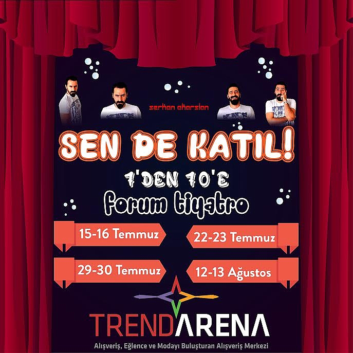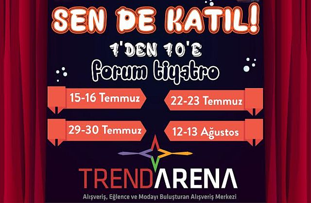 Çorlu Trend Arena Alışveriş Merkezi açıldığı günden beri gerçekleştirdiği etkinliklerle, İlklerin ve Etkinliklerin Adresi olarak zirvede kalmaya devam ediyor. Hem alışveriş hem yaşam merkezi olarak ziyaretçilerini Trakya’nın İlkleri ile buluşturan Trend Arena, konforlu alışveriş ve modanın yanı sıra doyasıya eğlencede etkinlik hikayesine bir yenisini daha ekleyecek. 7’den 70’e Sen De Katıl diyen Trend Arena forum tiyatro etkinliği ile yine Trakya’da bir ilki gerçekleştirecek. Forum tiyatro oyunları isimleri ise oldukça merak uyandırıcı. Tatanta Kızılderili Kabilesi, Humbamba Afrika Oyunu, Balıkçı Osman ve Arif Usta Aşçılık Okulu oyunlarını 15-16-22-23-29-30 Temmuz tarihlerinde yetişkinler ve çocuklar için ayrı konseptler ile sunacak. 12-13 Ağustos tarihlerinde ise sadece çocuklara yönelik forum tiyatro, minikler ile buluşacak. Gerçekleştirdiği tüm etkinlikler gibi bu etkinlik de Trend Arena'da ücretsiz olacak.