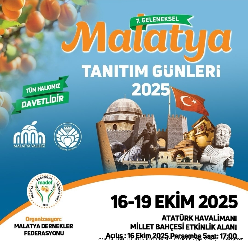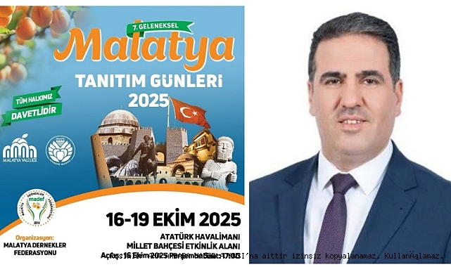 7. Geleneksel Malatya Tanıtım Günleri 16–19 Ekim’de Atatürk Havalimanı Millet Bahçesi’ndeMADEF (Malatya Dernekler Federasyonu) tarafından geleneksel olarak düzenlenen Malatya Tanıtım Günleri’nin 7’ncisi, bu yıl 16–19 Ekim tarihleri arasında Atatürk Havalimanı Millet Bahçesinde gerçekleştirilecek.Etkinlikte Malatya’nın kültürel değerleri, yöresel lezzetleri ve geleneksel el sanatları ziyaretçilerle buluşacak. Dört gün sürecek tanıtım günlerinde konserler, halk oyunları gösterileri ve çeşitli etkinliklerle katılımcılara renkli anlar yaşatılacak.MADEF Genel Başkanı Yılmaz Durmuş, yayımladığı davet mesajında;
