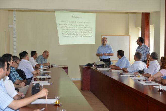 Kamu kurum personelinin katılımıyla gerçekleştirilen “Kamuda Etik Eğitimi” konulu toplantının sunumunu yapan Başbakanlık Etik Kurulu Etik Eğitici Sertifikalı Adana Defterdarlık Uzmanı Hakan Yıldız, Türkiye’de etik ile ilgili iki temel örgütlenme olduğunu ve bunların; Başbakanlık bünyesindeki Kamu görevlileri Etik Kurulu ile kurum ve kuruluşlarda oluşturulan etik komisyonları olduğunu ifade etti.