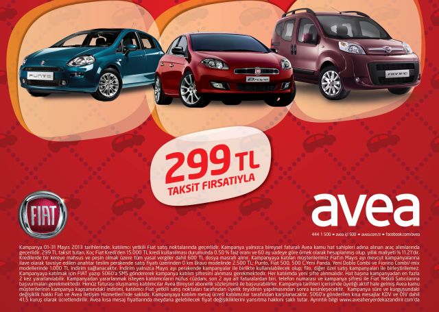 Ayakları yerden kesen kampanyaya katılan Avealılar, Fiatın Mayıs ayı mevcut kampanyalarına ilave olarak anahtar teslim satış fiyatı üzerinden 0 km, Bravo modeline 2.500 TL; Punto, Fiat 500, 500 C, Yeni Panda, Yeni Doblo Combi ve Fiorino Combi/-mix modellerine de 1.000 TL ek indirim avantajıyla sahip olacak.
