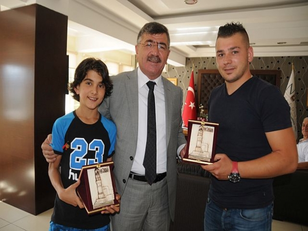 27 Temmuz - 02 Ağustos tarihleri arasında Çanakkale'de yapılan minikler tekvando şampiyonasında Türkiye 2.si olan Mithat Kaya'ya ve Antrenörü Şaban Çalkan'a plaket veren Niğde Belediye Başkanı Faruk Akdoğan sporcuların başarılarının devamını diledi.