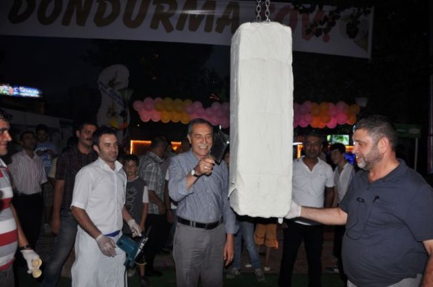 Başkan Yusuf Özdemir, açılıştan önce kepçeye asılı olan 250 KG ağırlığındaki Kahramanmaraş Dondurmasını satırla keserek açılışa katılanlara ikram etti.