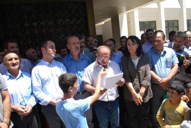 AHA-BATMAN-Barış ve Demokrasi Partisi Batman İl Başkanlığı Yüksek Seçim Kurulunun KCK tutuklusu olan Hatip Dicle için verdiği kararı protesto amaçlı basın açıklaması yaptı. Batman Belediyesi bahçesinde kılınan Sivil Cuma namazı sonrasında kalabalık basın açıklaması için Batman Belediyesi önüne geçti.Aralarında Batman Belediye Başkan vekili Serhat Temel,BDP Batman il başkanı Şehmus Aslan,BDP İl Eş başkanı Saadet Becerikli’nin de bulunduğu kalabalık, “Baskılar bizi yıldırama,YSK Şaşırma sabrımızı taşırma,Dicle Meclise” sloganları atıldıktan sonra basın açıklaması okundu.Açıklamayı BDP Parti Meclis üyesi Ebedin Satıcı okudu.Satıcı açıklamasında yıllardır Kürtlerin ezildiğini,haklarının çiğnendiğini ve bu son YSK’nın kararı ile bıçağın kemiğe dayandığını ve sabırların taştığını söyledi.Hatip Dicle’nin seçileceği durumunda tutukluluğunun biteceğinin bilindiğini ve buna rağmen Hatip Dicle’nin seçime girmesine sesiz kalındığını belirten Ebedin Satıcı , “daha önce bağımsız adayların bir kısmını veto eden kamuoyunun tepkisine karşılık geri adım atan YSK’nın bu kez Kürtlerin kendi onurları kabul ettiği oyları ile seçtiği vekillerini siyasi hesap oyunlarına kurban etmiştir.Yani siyasi hesapları için Kürtlerin onuru ile oynamaktan çekinmemiştir.Kürtler on yıllardır haklarının kabul edilmesi için her türlü bedel ödemişlerdir.Ancak onurlarını bu kadar açık aleni çiğnenmesi fazladır.Bıçak kemiği delecek düzeye gelmiş ve sabırlar taşmıştır,sonucu herkese dokunacak ve zarar verecektir.”dedi