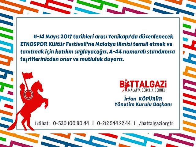 Malatya'nın kültürünün tanıtımında ve temsilinde öncü sivil toplum kuruluşlarından olan ve hemen hemen tüm etkinliklerde boy gösteren İrfan Köpürür başkanlığındaki Battalgazi Malatya Gençlik Derneği, Etnospor Kültür Festivali'ne de katılarak hem Malatya'yı temsil edecek hem de Malatya kültürünü vatandaşa anlatacak. Battalgazi Malatya Gençlik Derneği Yönetim Kurulu Başkanı İrfan Köpürür yapılacak olan özel etkinliğe katılımların mutluluk vereceğini söyleyerek standlarının A-44 numarada olduğunu belirtti. Yoğun katılımla gerçekleşmesi beklenen etkinlik 11-14 Mayıs tarihleri arasında Yenikapı'da gerçekleşecek.