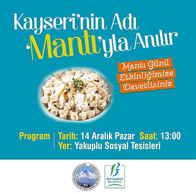 Beylikdüzü Belediyesi ve Kayseri İli ve İlçeleri Yardımlaşma ve Dayanışma Derneği işbirliğiyle “Kayseri’nin Adı Mantıyla Anılır” sloganıyla düzenlenen Mantı Günü Etkinliği’nde, el emeğinin en önemli ürünü mantı, Beylikdüzü’lülerin beğenisine sunulacak. 14 Aralık Pazar günü, saat 13:00’te Yakuplu Sosyal Tesisleri’nde Beylikdüzü halkı lezzetli bir gün yaşayacak.