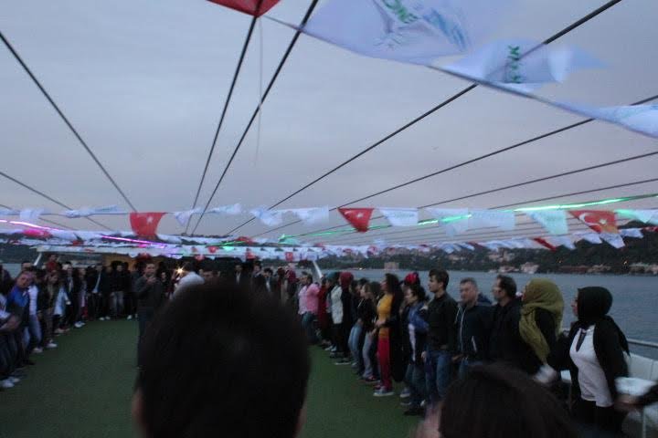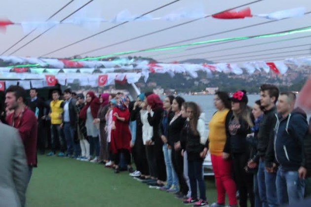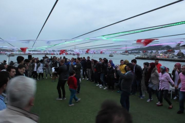 Boğaz’ın serin havasında, üst katta tulum, alt katta kemençe çalınan gemide, gençlerin keyifli