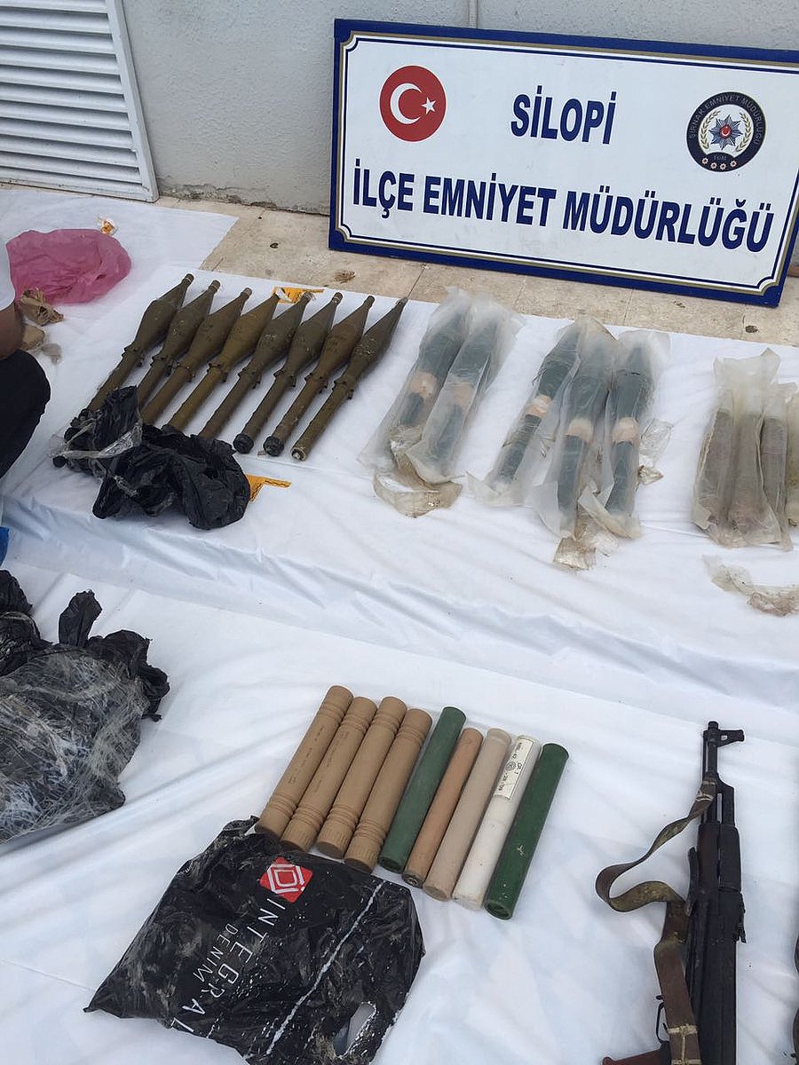 Şırnak Emniyet Müdürlüğü ekipleri Şırnak'ın Silopi ilçesinde yapılan istibarat çalışmaları neticesinde terör örgütü PKK/KCK mensuplarının Başak ve Ofis mahallelerinde silah ve mühimmat sakladıkları tespit edildi. 2 ayrı adreste yapılan aramalar sonucunda 20 adet roket başlığı, 1 adetkeskin nişancı tüfeği(kanas), 4 adet piyade tüfeği ve bunlara ait şarjör ve fişekler ele geçirildi.