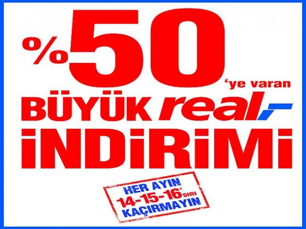Real “Büyük Real İndirimi”ni, her ayın 14-15 ve 16’sında düzenli olarak gerçekleştirerek tüketicilere yüzde 50’ye varan fiyat avantajıyla alışveriş yapma imkanı sunmaya devam edecek.