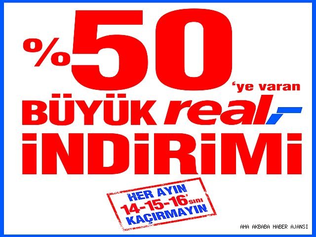 Koşulsuz müşteri memnuniyeti ilkesiyle hizmet veren Real Hipermarketler Zinciri, 14-15-16 Şubat tarihlerinde “Büyük Real İndirimi” gerçekleştirerek gıda ve gıda dışı ürünlerini yüzde 50’ye varan fiyat avantajıyla sunuyor. Tüketiciler, 14-15-16 Şubat tarihlerinde, kıymadan muza, deterjandan una, valizden telefona birçok ürünü büyük fiyat avantajıyla satın alabilecek.