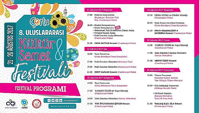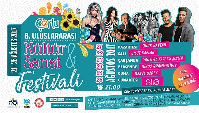 21-26 Ağustos 2017 tarihleri arasında gerçekleştirilecek olan Çorlu Belediyesi 8. Uluslararası Kültür ve Sanat Festivali’nde bu yıl ünlü sanatçıların sahne alacağı konserlerin yanı sıra heykel ve geleneksel el sanatları atölyeleri, yurtiçi ve yurt dışından gelen dans topluluklarının gösterileri, fotoğraf sergisi, tenis ve yüzme turnuvaları, yoga etkinlikleri, zumba etkinliği, olta balıkçılığı turnuvası ve off-road yarışları düzenlenecek.