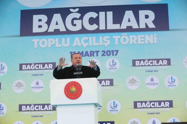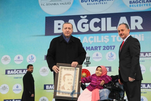 Bağcılar’ın İstanbul Büyükşehir Belediye Başkanlığı’na aday olduğunda, haksız şekilde mahkûm edilip cezaevine gönderildiğinde, 2002 yılında milletvekilliği seçimini kazanıp ülke yönetimini kazandığında her zaman yanında olduğunu ifade etti. Bağcılar’ın, Cumhurbaşkanı seçilmesi sürecinde, seçim ve referandumda ahde vefasını gösterdiğini kaydeden Erdoğan, gezi olayları, 17-25 Aralık darbe girişimi süreci, 10 Ağustos 2014 yılında Cumhurbaşkanlığına aday olduğu süreçte yüzde 70 oy vererek farkını gösterdiğini kaydetti. Erdoğan, Bağcılarlıların, 16 Nisan referandumunda da güçlü şekilde ‘evet’ diyeceğini anlattı. Erdoğan, “15 Temmuz darbe girişiminde Bağcılar da sokaklara döküldü. Milletine, istiklaline ve istikbaline canı pahasına sahip çıktığını gösterdi. Ramazan Sarıkaya şehidimizin kısa mektubunu Bağcılar Belediye Başkanı Lokman Çağırıcı Bey okudu. Allah rahmet eylesin. Rabbim ailesine sabırlar versin. İnşallah milletimizin başı sağolsun. Bağcılar o gece Anadolu’yu bize yurt haine getiren Selçuklu ve Osmanlının o şanlı mirasına sahip çıktı. Çanakkale Kurtuluş Savaşı şehitlerinin terörle mücadele şehitlerinin ruhunun yeniden dirilişine şahitlik etti”