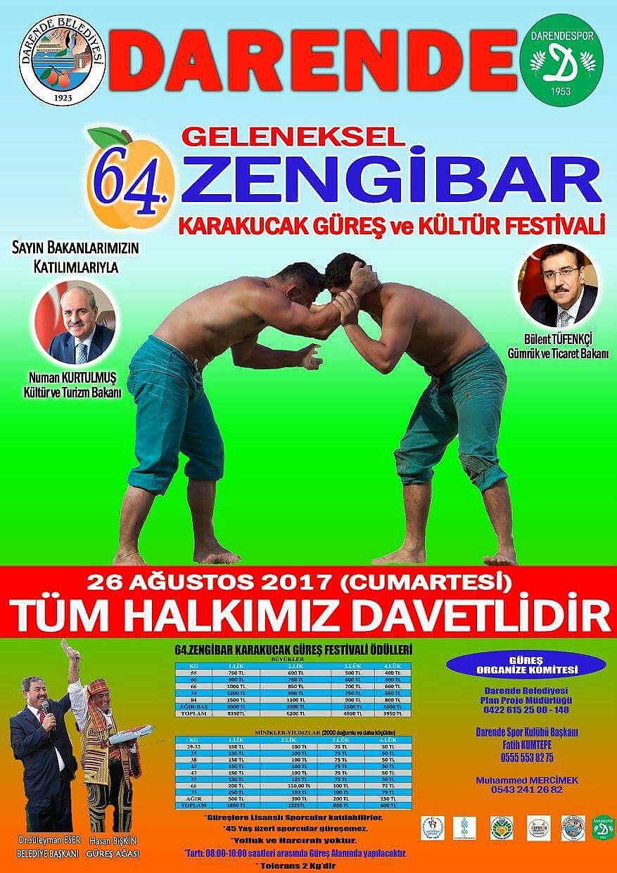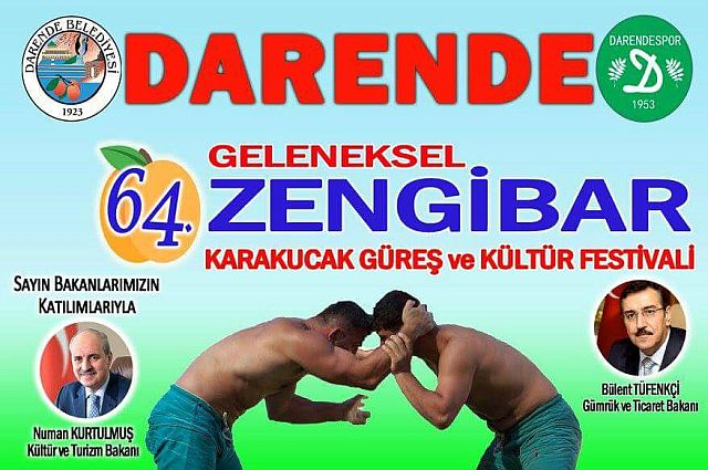 Malatyalılar'ın her yıl geleneksel olarak düzenlediği bu yıl 64'üncüsü düzenlenecek olan Geleneksel Zengibar Karakucak Güreş ve Kültür Festivali ile hem ata sporumuz olan güreşle kültürümüz yad edilecek hem de birlik ve beraberlik sağlanacak. Darende Güreş Alanı'nda yapılacak dev festival 26 Ağustos Cumartesi günü gerçekleşecek. Katılan sporculara ödüllerinde verileceği bu büyük organizasyona Kültür ve Turizm Bakanı Numan Kurtulmuş ve Gümrük ve Ticaret Bakanı Bülent Tüfenkçi'de katılacak. Darende Dernekler Federasyonu Başkanı Hulusi Eser festival için yaptığı açıklamasında, ''Tüm derneklerimizi, üyelerimizi vatandaişarımızı tüm Malatyaya'yı bu özel güne davet ediyoruz'' ifadelerini kullandı.