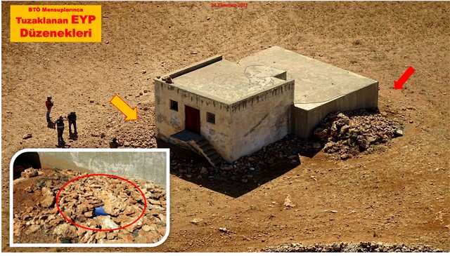 Konuyla ilgili olay yeri incelemesi neticesinde; mayın/EYP düzeneklerinin (6) adet jelikan bidon içerisine konulduğu, yaklaşık (420) kg Amonyum Nitrat kullanıldığı, Alfa Fire ateşleme anahtarı ve (8)’li pil bloğu tekniğiyle infilaklarının planlandığı tespit edilmiş olup, C.Savcılığın talimatı doğrultusunda delil olabilecek bulgular muhafaza altına alınmış, mayın/EYP yapımında kullanılan diğer malzemeler Patlayıcı Madde İmha Timi tarafından emniyetli bir şekilde tahrip edilmiştir'' ifadeleri kullanıldı.