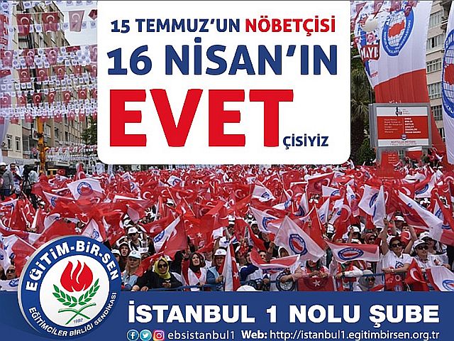 Geçtiğimiz günlerde Eğitim- Bir- Sen İstanbul 1 Nolu Şube "Gündem" temalı 5. Şube Divanı gerçekleştirdi. Yapılan divan toplantısında üye sayısı konusu tartışılırken 16 Nisan'da yapılacak referandumun da kararı verildi. Eğitim- Bir- Sen İstanbul 1 Nolu Şube Başkanı Ferhat Öztürk toplantı da yaptığı konuşmada, ''Bizim için önümüzdeki süreçte iki önemli gün var. Bunlardan biri 16 Nisan diğeri ise 15 Mayıs. 15 Mayıs üye sayımızın net olacağı tarih ve bu tarihe kadar hedefimiz 8800 olan üye sayımızı 10.001 yapmak. 16 Nisan'ın önemini hepimiz biliyoruz referandum var. Biz Evet diyeceğimizi söyledik. Bir daha 15 Temmuzların yaşanmaması için, ülkemizin bekası için Evet diyeceğiz. Bizler 15 Temmuz'un nöbetçisi 16 Nisan'ın Evetçisiyiz sloganıyla hareket edeceğiz'' şeklinde konuştu. Gerçekleştirilen divanda Bakırköy İlçe Milli Eğitim Müdürü Emrullah Aydın, Bağcılar İlçe Milli Eğitim Müdürü Mustafa Yılmaz, Bahçelievler İlçe Milli Eğitim Müdürü Emin Çıkrıkçı, Başakşehir İlçe Milli Eğitim Müdürü Ramazan Yılmaz, Güngören İlçe Milli Eğitim Müdürü Yusuf Kahraman, İstanbul İl Milli Eğitim Şube Müdürü Ahmet Coşkun, Bağcılar İlçe Başkanı Mükremin Köse, Bahçelievler İlçe Başkanı Aydın Gerçek, Bakırköy İlçe Başkanı Acem Yıldırım, Başakşehir İlçe Başkanı Tuncay İncebacak, Esenler İlçe Başkanı Emin Balaman, Güngören İlçe Başkanı Emin Erdoğan, Zeytinburnu İlçe Başkanı İsmail Çetinkaya da bu özel toplantıda yerlerini aldılar.
