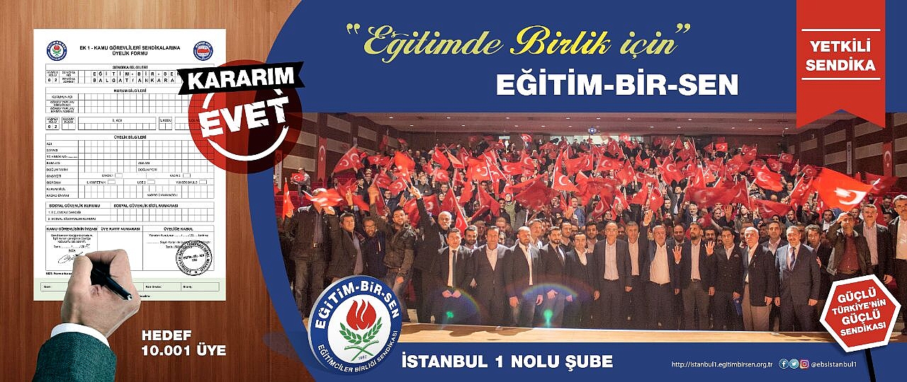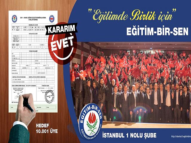 Bölgesinin en aktif ve en güçlü, en büyük ve en örgütlü yapısı olan Ferhat Öztürk başkalnlığındaki Eğitim Bir-Sen İstanbul 1 Nolu Şube, önüne yeni hedef koyarak üye sayısını arttırmaya yönelik çalışmalarına başladı. Sendikanın kuruluşundan bugüne bir çok başarılı çalışmalara, organizasyonlara imza atan Eğitim Bir-Sen Bir Nolu Şube'nin yeni hedefi üye sayısını 10.001 yapmak. Başkan Ferhat Öztürk tüm eğitimcileri davet ederek, ''Biz bölgenin en aktif yapısı olarak çalışmalarımıza her zaman devam edeceğiz. Her zamankinden daha çok çalışacağız. Hedeflediğimiz 10.001 sayısına ulaşana kadar durmayacağız. Bizim bu çalışmalarmız eğitim geleceğine büyük bir yatırım olacaktır. Bizim görevimiz yetişecek neslin eğitimde ve maneviyatta daha bilinçli, başarılı ve daha aktif yapıya ulaşmalarını amaçlamaktır'' diye konuştu.