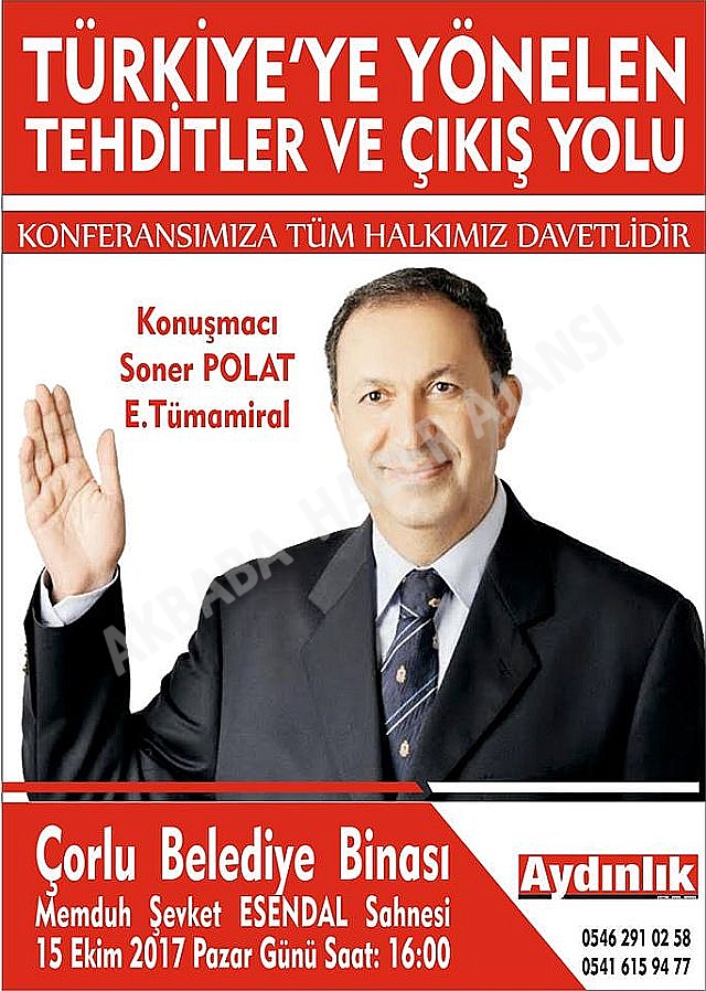 Konu ile ilgili olarak Vatan Partisi Çorlu İlçe başkanlığından yapılan açıklamada; “2011 Şubat’ında FETÖ’cü Balyoz kumpası nedeni ile zindanlara atılan. 2014 Haziranında serbest kalan Deniz Kuvvetleri Komutanlığında istihbarat daire başkanlığı yapmış olan Soner Polat 15 Ekim’de konferans için Çorlu’ya geliyor. “Türkiye’ye yönelen tehditler ve çıkış yolu” konulu Aydınlık Gazetesinin düzenleyeceğikonferansta, Ortadoğu’daki sorunlar ve bölge ülkeleri ile ilişkiler masaya yatırılacak.Emekli Tümamiral Soner Polat aynı zamanda Vatan Partisi Genel Başkan Yardımcısı ve Aydınlık Gazetesi yazarıdır. Daha önceleri uçak krizi sonrası Rusya’ya giderek Rusya devlet Başkanı Vladimir Putin’inin Baş danışmanı AleksindirDuğin ile görüşerek Rusya Türkiye ilişkilerinin düzeltilmesinde önemli katkılar sunan ve Suriye İran ziyaretleri ile bölge ülkeleri ilşkilerinde belirleyici katkıları olan Polat’ın Çorlu’da önemli açıklamalar yapması bekleniyor. 15 Ekim Pazar günü Saat 16:00’da Çorlu Belediyesi Memduh Şevket Esendal Sahnesinde gerçekleşecek konferans ile ilgili çalışmalar hakkında Aydınlık Gazetesi Trakya Temsilciliği bir açıklama yaptı. Yapılan açıklamada şunlar söylendi. Çalışmalarımız Çorlu’da halktan büyük ilgi gördü. Konferansımıza katılımın yüksek olmasını bekliyoruz. Türkiye’mizin Vatan savaşı verdiği, terör örgütleri ile topyekûn mücadele yürüttüğü bu dönemde bölge sorunlarını çok iyi bilen Soner Polat’ın Çorlu’ya geliyor olması çok önemli. Tüm Vatansever Çorlu halkını konferansımıza bekliyoruz” ifadelerine yer verildi.