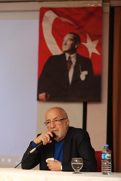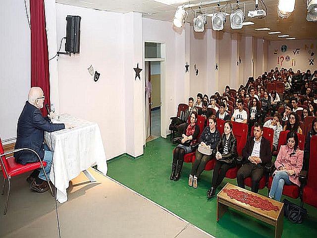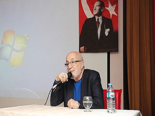 Emin Olcay, tiyatronun da meşakkatli bir iş olduğunu söylediği konuşmasında, sahnelediği oyunlardan görselleri öğrencilerle paylaşarak, unutamadığı anılarını anlattı: