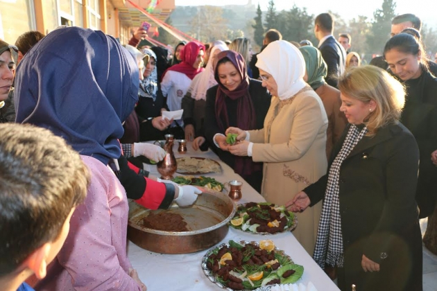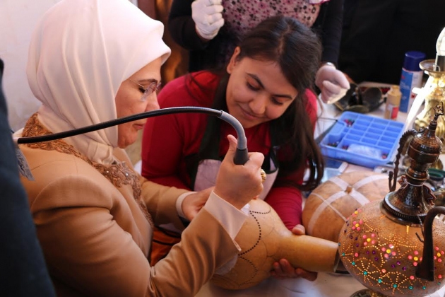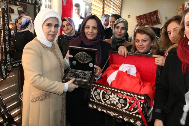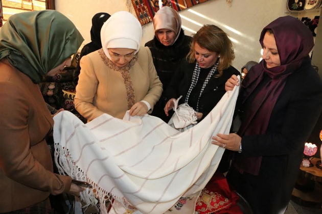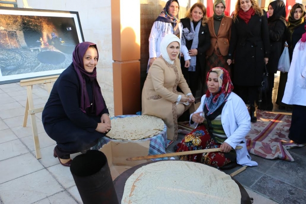 Şanlıurfa Büyükşehir Belediyesi Kültür ve Sosyal İşler Daire Başkanlığı Kadın ve Aile Şube Müdürü ve Büyükşehir Belediye Başkanı Nihat Çiftçi'nin eşi Sema Çiftçi'nin eşlik ettiği Emine Erdoğan'a çarşıda el işi, yöresel mutfak ve gıda ürünleriyle ilgili bilgi verildi.