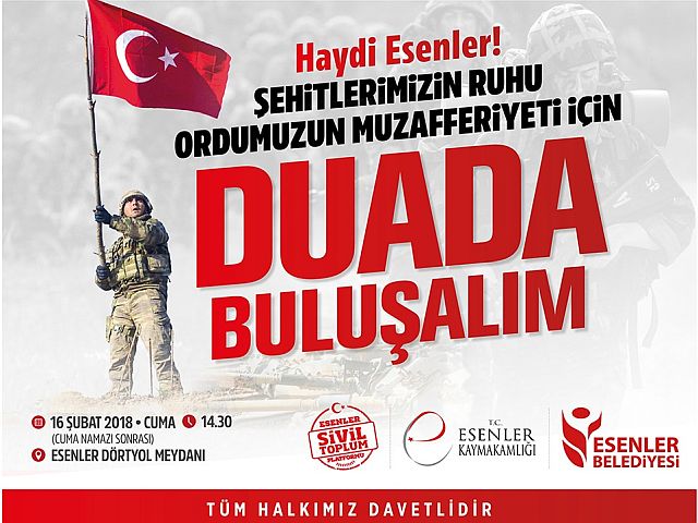 Afrin'de sürdürülen "Zeytin Dalı" harekatına destek çığ gibi büyüyor. Kahraman Mehmetçiklere destek olmak amacıyla Esenler Kaymakamlığı, Esenler Belediyesi ve STK'lar 16 Şubat 2018 tarihinde cuma namazı çıkışında Esenler Dörtyol Meydanı'nda binlerce el semaya kalkarak, Şehitlerin ruhu ve kahraman Mehmetçiğin muzafferiyeti için dua edecek. Esenler Kaymakamlığı ve Esenler Belediyesi resmi internet sitelerinden yapılan açıklama tüm vatandaşları davet ederek Kahraman Mehmetçiğe destek olma çağrısında bulunuldu.