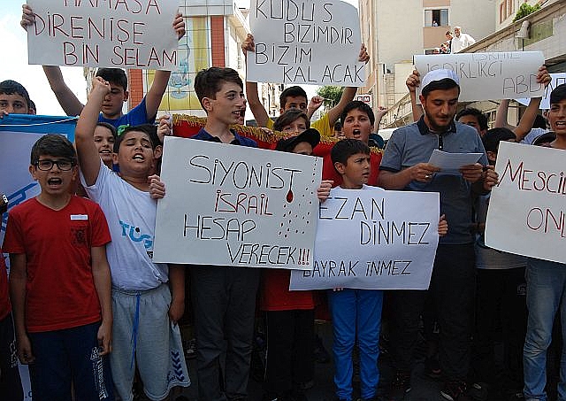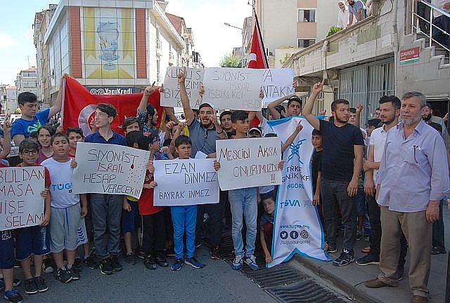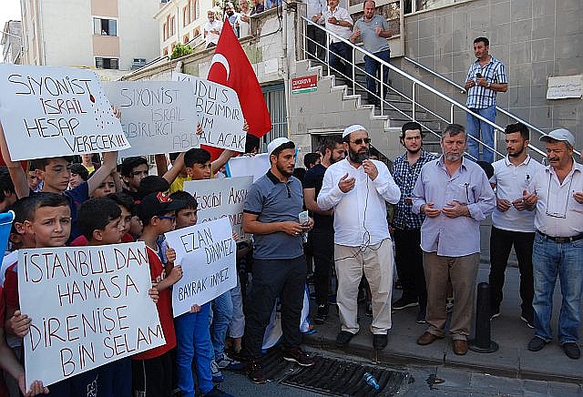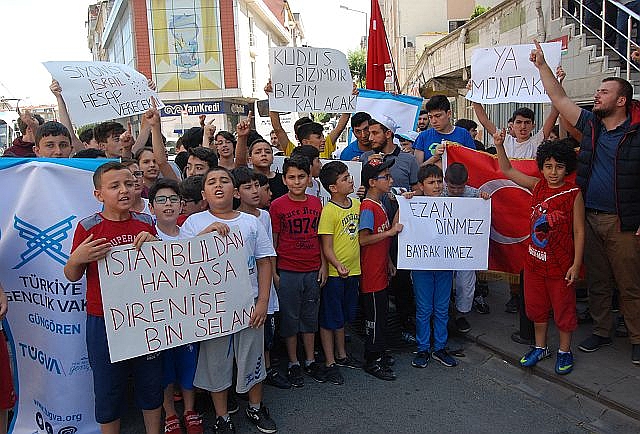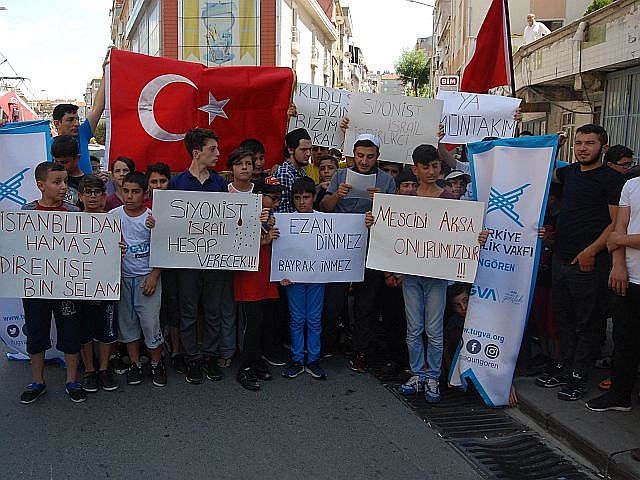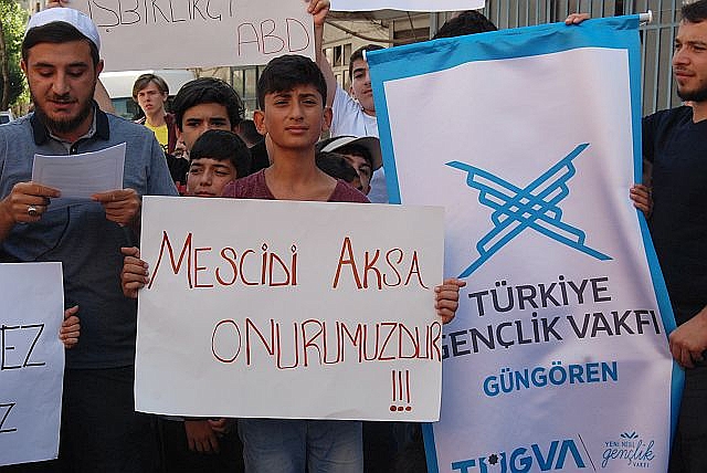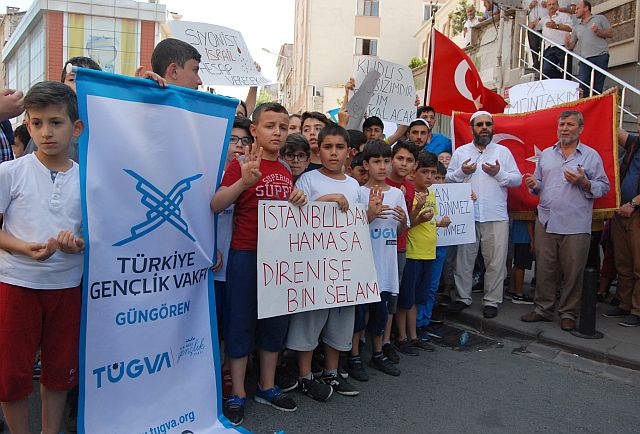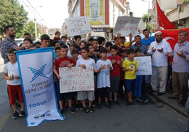 İsrail askerlerinin Müslümanların Mescid-i Aksa'ya girmelerine yönelik yaptığı uygulamalara tepkilere Türkiye'den tepkiler çığ gibi büyüyor. İstanbul Güngören'de Cuma namazı sonrası Tügva temsilciliği İsrail'e tepki amaçlı basın açıklaması yaptı. Ellerinde 'Kudüs bizimdir bizim kalacak','Siyonist İsrail hesap verecek','İstanbul'dan Hamas'a direnişe bin selam' yazılı pankartlar açan gençler İsrail'e karşı sloganlar attılar.