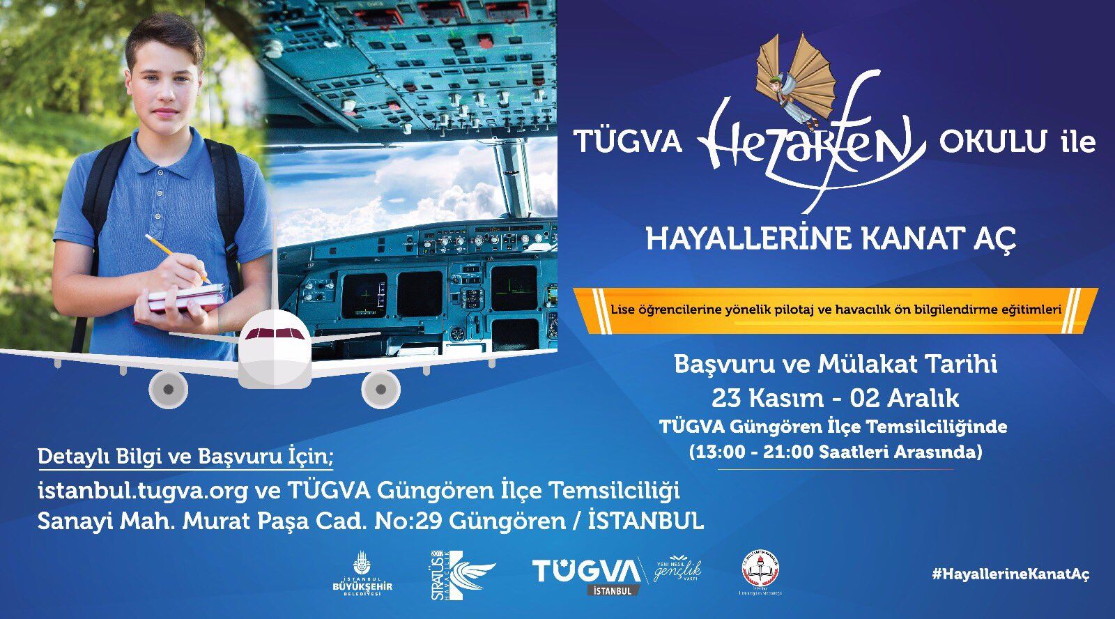 Abdullah Yılmaz başkanlığındaki Tügva Güngören İlçe Temsilciliği gençlerin daha bilinçli, daha sağlıklı ve donanımlı olmaları için elinden geleni yapmaya devam ediyor. Tügva Hazerfan Okulu ile lise gençliğinin hayallerinde her zaman yeri olan pilotluk için eğitimlere başlanacak. Lise öğrencilerine yönelik pilotaj ve havacılık ön bilgilendirme eğitiminden yararlanmak isteyen gençler 23 Kasım - 2 Aralık tarihleri arasında başvurularını yapıp mülakata alınacak. Başvurular ve mülakatlar Tügva Güngöre İlçe Temsilciliğinde yapılacak.