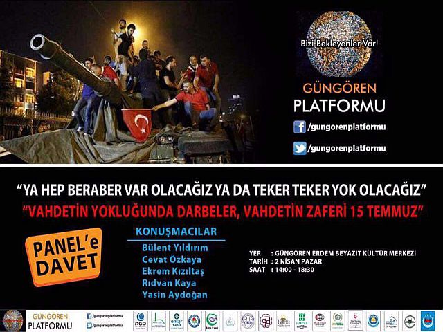 İHH Güngören, ensar vakfı, Genç Osman Vakfı, Anadolu Gençlik Derneği, İlim Yayma Cemiyeti, Hakçader, Medeniyet Vakfı, GündinDer, GünDer, Vuslat Derneği gibi STK'ların üyesi olduğu ve Ya hep beraber var olacağız, ya da teker teker yok olacağız sloganı ile yola çıkan Güngören Platformu, "Vahdetin yokluğunda darbeler, Vahdetin zaferi 15 Temmuz" konu başlıklı bir panel düzenliyor. Bülent Yıldırım, Cevat Özkaya, Ekrem Kızıltaş, Rıdvan Kaya ve Yasin Aydoğan gibi isimlerin konuşmacı olarak katılacağı panel 2 Nisan Pazar günü saat 14.00 - 18.30 arası Güngören Erdem Beyazıt Kültür Merkezi'nde yapılacak.