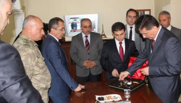 Hassa Kaymakamı Mustafa PALA tarafından ,Vali Ercan TOPACA’ya ,Bakır İşlemeciliği Kursunda Hassalı kadınlar tarafından işlenilen plaket ve kahve fincan takımı hediye edildi.