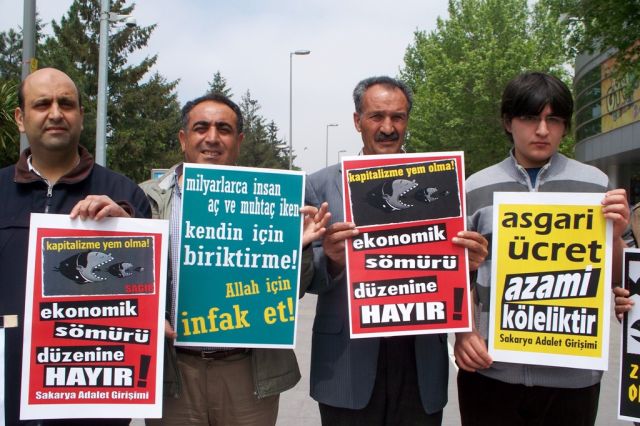 Küresel kapitalizme karşı küresel intifada ve Devletin, kapitalizmin, küresel sermayenin, bankaların değil Rabbimizin kuluyuz yazılı pankartların açıldığı eylemde Milyarlarca insan aç ve muhtaç iken kendin için biriktirme, Allah için infak et!, Asgari ücret, azami kölelik, 1 Mayıs, insanlığı ve doğayı ifsad eden küresel kapitalizme lâ diyoruz! yazılı dövizler taşındı. Basın açıklaması Yaşasın küresel intifada ve Susma haykır, zulme hayır! sloganlarıyla son buldu.