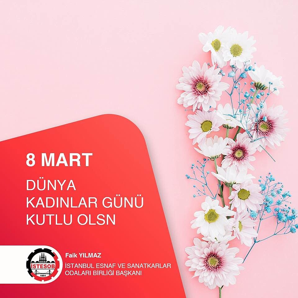 İstanbul Esnaf Ve Sanatkarlar Odaları Birliği (İSTESOB) Başkanı Faik Yılmaz yaptığı açıklamada ''Hem toplumun hem de ailenin temelini oluşturan tüm kadınların 8 Mart Dünya kadınlar gününü kutluyorum. Kadına şiddetin son buldugu daha iyi bir dünya dileğıyle''dedi.