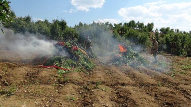 Gökdere ve Kırkbulak köyleri kırsalında yapılan operasyonda 7 esrar tarlası tespit edilerek tek tek esrarlar toplanarak yakıldı. Yapılan operasyonun ardından
