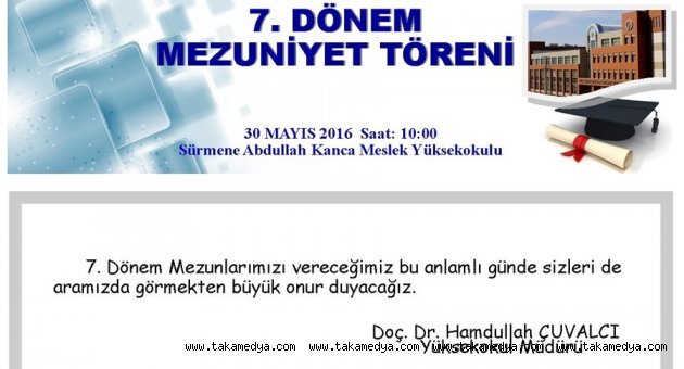 Meslek Yüksekokulu Müdürü Doç. Dr. Hamdullah Çuvalcı, 30 Mayıs 2016 Pazartesi günü, Çamburnu-Sürmene’deki eğitim binalarında, saat 10:00’da başlayacak 7. Dönem Mezuniyet Töreni Programlarına tüm vatandaşların davetli olduğunu söyledi.
