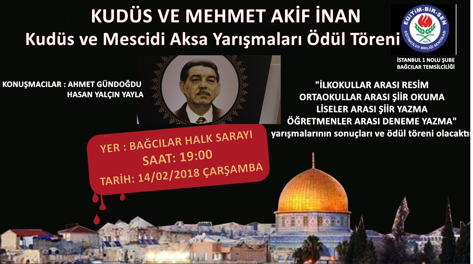 Eğitim - Bir - Sen İstanbul 1. Bölge Bağcılar Temsilciliği geçmişe ve geleceğe sahip çıkıyor. Edebiyatın temel taşlarından ve Eğitim Bir Sen'in de genel başkanlığı yapan Merhum Mehmet AKif İnan ve geçmişten günümüze Müslüman aleminin kanayan yarası haline gelen Mescidi Aksa'yı unutturmamak, gelecek nesillere sevdirmek amaçıyla düzenlen yarışmanın ödül töreni 14 Şubat 2018, saat 19.00'da Bağcılar Halk Sarayı'nda düzenlenecek. Küdüs Davası'na sahip çıkarak ardında sayısıs eser bırak Mehmet Akif İnan'ın şiirlerininde okunacağı gecede, İlkollar arası resim, Ortaokullar arası şiir okuma, Liseler arası şiir yazma ve öğretmenler arası deneme yazma branşlarında ödüller sahiplerine kavuşacak. Geceye konuşmacı olarak katılan Ahmet Gündoğdu, Hasan Yalçın Yayla'da, törene katılan misafirlere bilgi ve deneyimleriyle eşsiz bir gece yaşatacak.