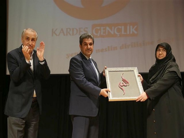 Program sonunda Esenler Belediye Başkanı M. Tevfik Göksu, Şehit Mehmet Yılmaz'ın eşi Ayşenur Yılmaz'a Allah lafzı yazılı bir tablo hediye etti.