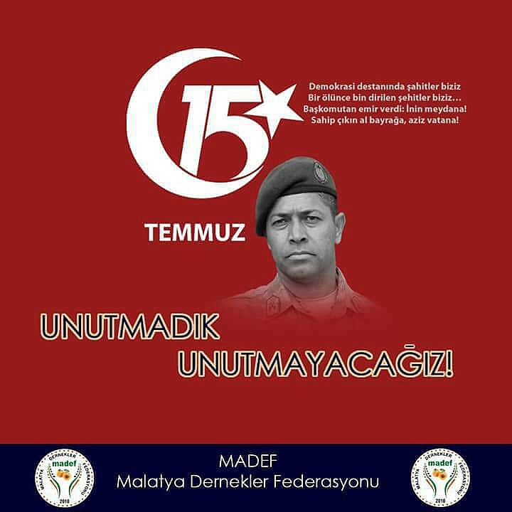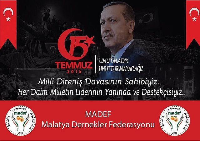 Yılmaz Durmuş başkanlığındaki Malatya Dernekler Federasyonu (MADEF), 15 Temmuz hainb darbe girişiminin yıl dönümünde her daim milletinin yanında olduklarına dair bir mesaj yayınladı. Milli direniş davasının sahibi olduklarını dile getiren Malatya Dernekler Federasyonu her daim milletin liderinin yanında ve destekçileri olduklarını belirtti. Duygu yüklü bir şiir de paylaşan Malatya Dernekler Federasyonu gönüllere de dokundu;