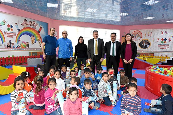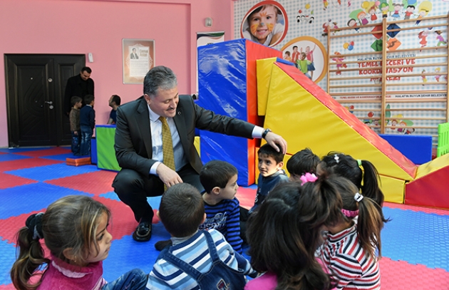 Büyükşehir Belediye Başkanı Ahmet Çakır Cemal Aslan Temel Beceri ve Eğitim Merkezi’ni ziyaret ederek çalışmalar hakkında bilgiler aldı.Cemal Aslan Temel Beceri ve Eğitim Merkezi ziyaretine Büyükşehir Belediye Başkanı Ahmet Çakır’ın yanı sıra Kültür ve Sosyal İşler Daire Başkanı İhsan Gencay ile bazı şube müdürleri katıldı. Eğitim Merkezindeki çalışmalar hakkında bilgiler veren Başkan Çakır, “Cemal Aslan Temel Beceri ve Eğitim Merkezimiz özellikle 4-6 yaş gurubu öğrencilere hizmet vermekte.Çocuklarımızın bedensel, fiziksel ve psikolojik gelişimlerine büyük katkı sağlayan merkezimizde ayrıca çocuklarımız hareket kabiliyetlerini de geliştirmekteler. Eğitim Merkezimizde Milli Eğitim Müdürlüğüne bağlı okullar ile engelli çocuklarımıza yönelik hizmet veren Özel Eğitim merkezlerimizde randevu alarak faydalanmaktalar dedi. Milli Eğitim Müdürlüğümüz ile Özel Eğitim Merkezlerinde eğitim gören yaklaşık 8 bin öğrencinin eğitim merkezimizden istifade etmesi bizleri mutlu etmektedir” dedi. Malatya Beydağı Geçici Eğitim Merkezinde kalan çocukların 5 Aralık Pazartesi gününden itibaren Cemal Aslan Temel Beceri ve Eğitim Merkezinden istifade ettiğini belirten Başkan Çakır, “Suriye’deki savaştan en fazla etkilenen çocuklarımızın eğlenmeleri ve psikolojik olarak rahatlamalarını sağlamak amacıyla hafta başından beri merkezimizde eğitim alıyorlar. Beydağı Geçici Eğitim Merkezinde kalan yaklaşık 300 çocuğumuz öğleden önce ve öğleden sonra iki grup halinde gelerek eğitim merkezimizden faydalanıyorlar. Bir haftadır devam eden eğitimlerini bugün tamamlıyorlar” şeklinde konuştu. Büyükşehir Belediye Başkanı Ahmet Çakır, Cemal Aslan Temel Beceri ve Eğitim Merkezinde 5 gün süreyle eğitim gören Suriyeli çocuklarla yakından ilgilenerek, çeşitli hediyeler verdi.