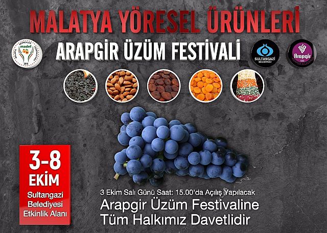 Malatya Dernekler Federasyonu(MADEF), Arapgir Belediyesi ve Sultangazi Belediyesi'nin organizasyonuyla gerçekleşecek olan Arapgir Üzüm festivali Sultangazi'de olacak. Malatya'nın yöresel ürünlerinin tanıtıldığı ve eğlenceli anlara tanıklık edecek olan Arapgir Üzüm Festivali 3 Ekim'de başlayacak olup 8 Ekim'e kadar devam edecek. MADEF Başkanı Yılmaz Durmuş, ''Tüm hemşehrilerimizi, dostlarımızı, tüm halkımızı bu güzel festivalde görmek bizi onurlandıracaktır'' ifadelerini kullandı. 3 Ekim'de açılışı yapılacak olan Arapgir Üzüm Festivali, Sultangazi Belediyesi Etkinlik Alanı'nda gerçekleşecek.