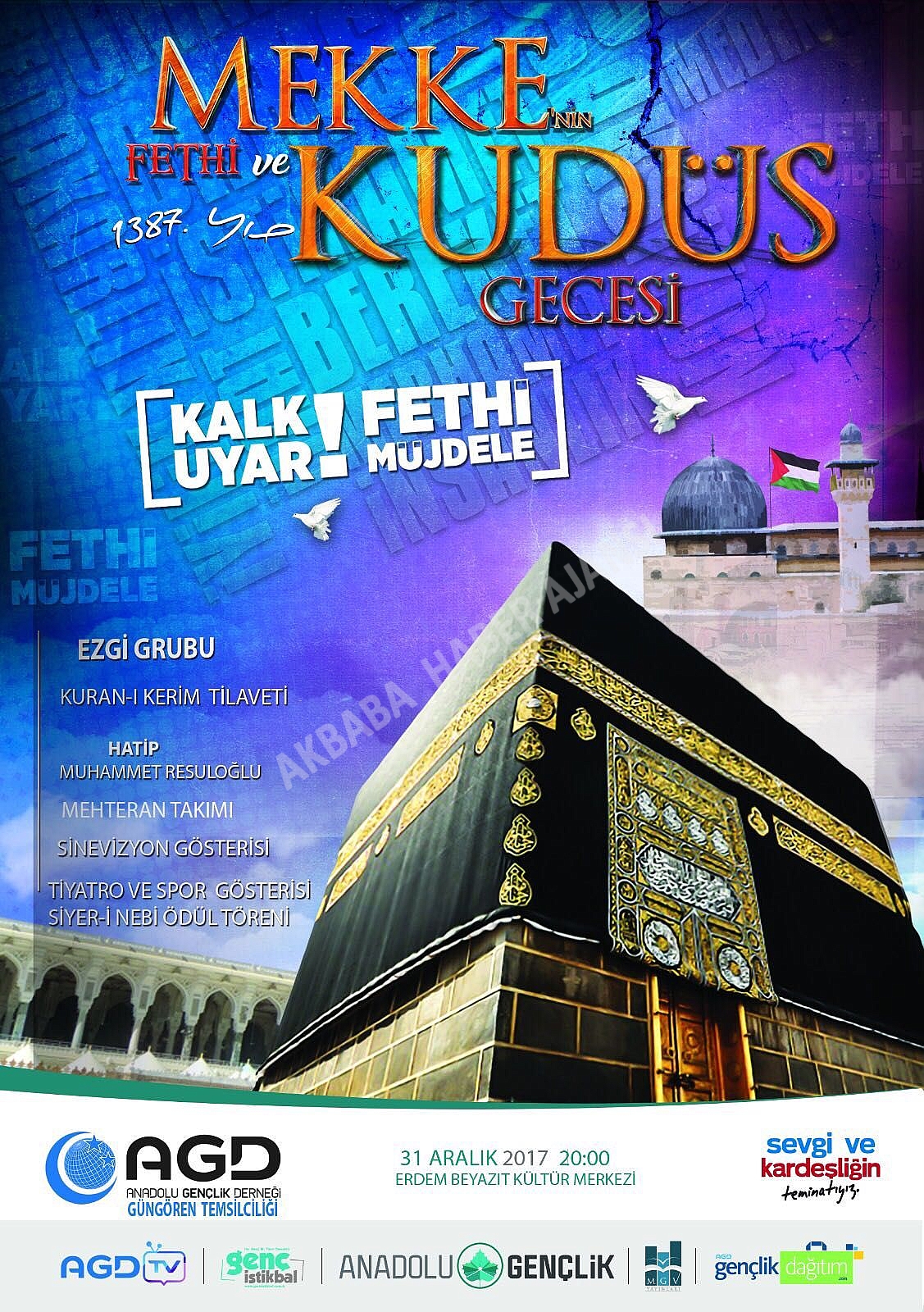 Anadolu Gençlik Derneği Güngören Temsilciliği Mekke'nin Fethi'nin yıldönümü dolayısıyla Mekke'nin Fethi ve Kudüs Gecesi düzenleyecek
