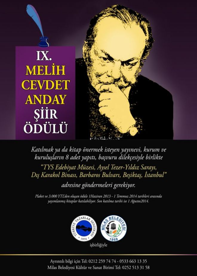 Melih Cevdet Anday, 1985 yılından itibaren yaz aylarını eşiyle birlikte Milas-Ören’deki yazlığında geçirmiş, 1999 yılında anıtı, Ören sahilinde, bugün onun adını taşıyan parka yerleştirilmiştir. Melih Cevdet Anday Şiir Ödülü seçici kurulu Doğan Hızlan, Şennur Sezer, Eray Canberk, Egemen Berköz, Refik Durbaş, Leyla Şahin, Enver Ercan’dan oluşan şiir yarışmasının ödülü Ağustos ayında 4. Uluslararası Milas Festivali kapsamında “IX. Milas-Ören Melih Cevdet Anday Şiir Günleri ve Keramos Kültür Şenliği”nde sahibine ulaştırılacak. Plaket ve 3.000 lira oluşan ödüle 1 Haziran 2013-1 Temmuz 2014 tarihlerin arasında yayınlanmış kitaplar katılabiliyor. Son katılım ise 1 Ağustos 2014 tarihi.