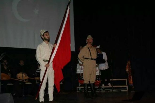 Bursa 22. dönem milletvekili Faruk Anbarcıoğlu’nun eserini Erdinç Ertüzün’ün yönetmenliğinde sahneye koyan oyuncular, Çanakkale Savaşı’nda yaşanan olayları yeniden bir kez daha anımsattılar. Çanakkale Savaşı’nda Mehmetçiğin duyduğu Vatan, Bayrak ve Din sevgisini dile getiren oyuncular, program sonunda dakikalarca ayakta alkışlandılar. Temsili olarak şehit düşen askerin göğsünden çıkarılan Türk Bayrağı’na sarılı Kuran-ı Kerim’i anlatının yönetmeni Erdinç Ertüzün, Mudanya ilçe Jandarma Komutanı Bnb. Nurettin Özdoğan’a teslim etti. Özdoğan ise, Türk Bayrağı ve Kuran-ı Kerim’i öperek teslim aldı.