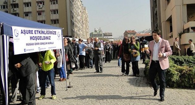 Aşure dağıtımı programında açıklama yapan MÜSİAD İzmir Şubesi Gençlik Kurulu Başkanı İsmail Çiftçioğlu, Hz. Peygamber'in yolundan gidildiği müddetçe onun ailesini, çocuklarını ve torunlarını da sevmemizi, onları dost kabul etmemiz gerektiğini ifade ederek, Ehl-i Beyt'e düşmanlık gösteren ve onlara zarar veren kim olursa olsun bütün Müslümanların düşmanıdır dedi. Çiftçioğlu konuşmasına; “Acı olan şudur ki, Hz. Peygamber'in vefatının üzerinden henüz kırk yıl geçmeden dünyevî çıkarlar, siyasi beklentiler ve benzeri gerekçelerle baş tacı ettiğimiz Hz. Peygamber'in torunlarının hunharca öldürülmesidir. Hiçbir mazeret bu katliamı mazur gösteremez. Vuku bulduğu ilk andan itibaren aklıselim sahibi bütün Müslümanlar, bu menfur hadiseye sebep olanları kınamıştır” dedi.