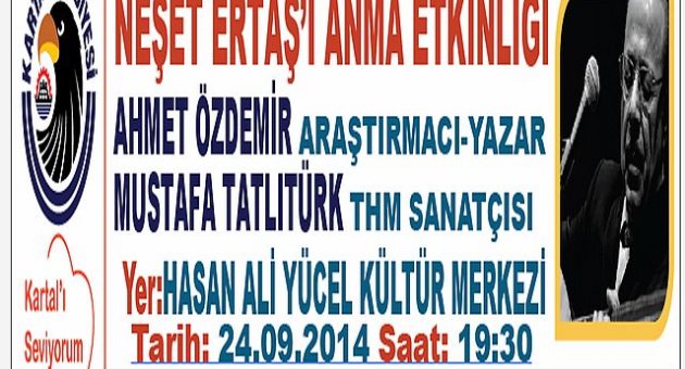 24 Eylül Çarşamba günü Kartal Hasan Ali Yücel Kültür Merkezi’nde gerçekleştirilecek Neşet Ertaş’ı Anma etkinlikleri, saat 19.30’da Araştırmacı Yazar Ahmet Özdemir’in konuşmasıyla başlayacak, daha sonra Türk Halk Müziği Sanatçısı Mustafa Tatlıtürk’ün seslendireceği türkülerle devam edecek.