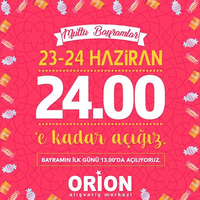 Bayram ve tatil alışverişleri dolayısıyla yoğun bir ziyaretçi trafiği yaşanan Orion’da, müşterilerin rahat rahat alışverişlerini yapabilmesi için mağazalar 24:00’e kadar açık olacak. Ünlü markaların bayram kampanyalarıyla çok cazip indirimler ve fırsatlar sunduğu Orion’da, 23 Haziran Cuma ve 24 Haziran Cumartesi günü mağazalar gece yarısı kapanacak.Bayramın birinci günü olan 25 Haziran Pazar günü de Orion saat 13:00’te açılacak. Ramazan’ın bitişi sebebiyle pazar gününden itibaren Orion yine 22:00’ye kadar açık olacak.