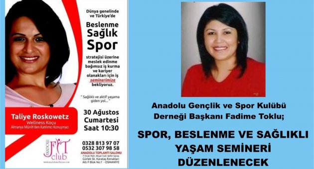 Osmaniye'de faaliyet gösteren Anadolu Gençlik ve Spor Kulübü Derneği Almanya’dan Yaşayan Sağlıklı Yaşam Koçu Taliye Roskowetz'in katımıyla seminer düzenleyecek.