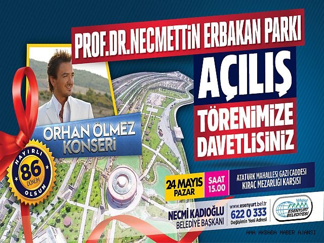 54’ncü Türkiye Cumhuriyeti Hükümeti Başbakanı Rahmetli Prof. Dr. Necmettin Erbakan’ın isminin verildiği 86 Dönüm parkın açılışına Erbakan Ailesi, İstanbul Büyükşehir Belediye Başkanı Kadir Topbaş, Bölge Milletvekilleri, Esenyurt Belediye Başkanı Necmi Kadıoğlu ve çok sayıda üst düzey katılım olacaktır.