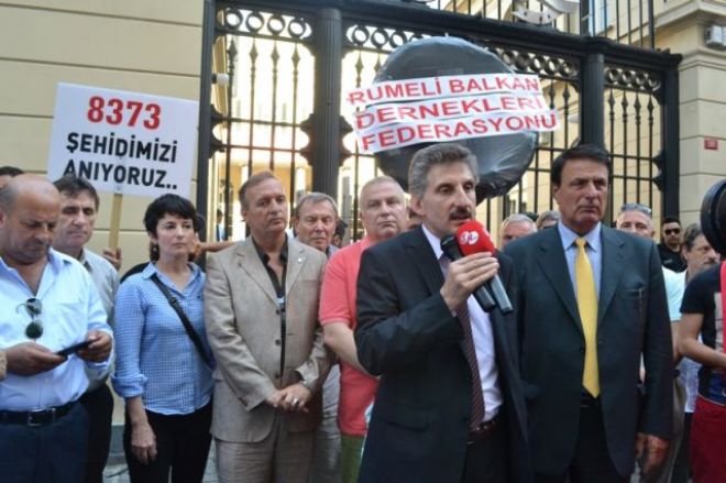 Galatasaray Lisesi önünde bir araya gelen Rumeli Balkan Dernekleri Federasyonu yöneticileri ve vatandaşlar, ellerinde dövizler taşıyarak sessiz bir yürüyüşle kortej eşliğinde Hollanda Başkonsolosluğu önüne geldiler. Yoğun güvenlik önlemlerinin alındığı Hollanda Başkonsolosluğu önünde bir basın açıklaması yapan Rumeli Balkan Dernekleri Federasyonu Genel Başkanı Ayhan Bölükbaşı, 19 yıl önce yapılan bu katliamı, bu soykırımı asla unutmayacaklarını söyledi. 5 gün içerisinde 8 bin 373 kişinin soykırım yapılarak şehit edildiğini vurgulayan Bölükbaşı, “Balkanlar’ın tarihi ,katliamlar tarihi gibidir. Özellikle Osmanlının zayıflama bölgeden çekilme dönemi ile birlikte Osmanlı ile özleşmiş tüm uluslar ve Müslümanlar büyük baskı ve ateş altına alınmıştır. 19 yıl önce Avrupa’nın göbeğinde tüm dünyanın gözleri önünde film seyredercesine bir soykırım yaşandı” dedi.