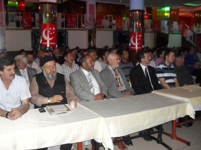 AHA-BAĞCILAR-Bağcılar Saadet partisi Genişletilmiş ilçe Divanı İlçe yönetimi,Hanımlar komisyonu,Gençlik Teşkilatı,Mahalle Yönetimi ve 12 Haziran seçimlerinde sandık başında görev yapan müşahitlerin katılımıyla Nazar Düğün Salonunda Yapıldı.Gece Milli Görüşün Lideri Prof.Dr.Necmeddin Erbakan’ın hayatının anlatıldığı sinevizyon gösterisiyle başladı.İlçe Divanın açılış Konuşmasını ilçe Başkanı Beşir İstemi’nin Yaptığı geceye Avrupa Milli Görüş Teşkilatından Hasan Damar Konuşmacı olarak katıldı,Başkan İstemi 12 Haziran seçimlerinin ülkemiz için hayırlı olmasını dilediklerini belirterek Bağcılar olarak Halkımızın tamamına yakınına ulaştıklarını ve Halkımıza gerçekleri anlattıklarını buna rağmen bazı oyunlar oynanarak,orantısız bir güç kullanan Hükümete karşı ve muhalefete karşı çalıştıklarını kesinlikle medyada kendilerine fazla yer verilmediğini ama bizler seferimizi layıkıyla yaptıklarını ama başarılı olamadıklarını bundan sonrada çalışmalarının devam edeceğini ALLAHIN Rızasını kazanmak için ölene kadar mücadeleye devam edeceklerini belirterek seçimlerde görev yapan tüm teşkilat görevlilerine teşekkür etti.Daha sonra söz alan Hasan Damar Milli Görüş’cünün hiçbir zaman kaybetmeyeceğini Hak ve Batıl mücadelesinin kıyamete kadar süreceğini bizlerinde her zaman hak’dan yana olacaklarını belirterek bu salonu dolduran Bağcılar teşkilatının çok şuurlu olduğunu bunu ispat ettiklerini belirterek insanların Dünyevileştiğini ve geleceğin Milli Görüşcü kadroların olacağını belirtti.1980 yılında Hastalanan M.Zahid Kotku Hocaefendiyi Mekkede Nimetullah Hocayla ziyaret ettiklerinde Hocaefendinin kendilerine Bedir savaşını atlattınız ama sizleri daha Uhud savaşının beklediğini belirterek Dünyevileşenlerin sizlerden ayrılacağını Ama zaferin kalanların olacağını söylediğini o zaman bunu fazla kavrayamadığını ama şimdi daha iyi anladığını belirterek Darul Erkamın temsilcilerinin Milli Görüşcüler olduğunu Ebu Cehilin yani Darul Nedveyi ABD ve Siyonizmin temsil ettiğini Belirterek Allah HER ZAMAN AYAĞIMIZI SABİT KILSIN DEDİ.Yıllardan beri Avrupadan gelerek seçim çalışmalarına katıldıklarını ve bu uğurda bir çok Arkadaşının Şehit olduğunu belirterek şimdi ise ılımlı İslam projesiyle insanların dinlerinden uzaklaştırılmağa çalışıldığını buna karşı daha fazla çalışarak kuyuya atılan Hz Yusuf nasıl kuyudan çıkarak hükümdar olduysa Mili Görüşünde % 1.5 çıkarak iktidar olacağını Zafer inananlarındır Zafer Yakındır diyerek konuşmasını sonlandırdı.