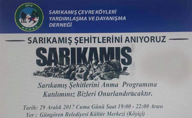 Birinci Dünya Savaşı’nda Sarıkamış Allahuekber Dağlarında donarak şehit olan 90 bin askerimiz anısına Sarıkamış Çevre Köyleri Yardımlaşma ve Dayanışma derneği tarafından düzenlenlenecek olan "Sarıkamış Şehitlerini Anıyoruz" anma programı, 29 Aralık'ta saat 19.00'da Güngören Belediyesi Konferans Salonunda gerçekleştirilecek.