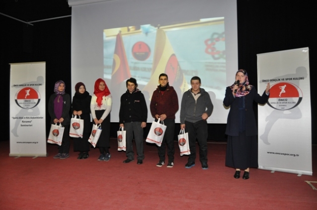 Seminerin son kısımlarında ise yönetimdeki isimlere plaket verilirken ayrıca öğrencilere soru sorularak bilen gençlere hediye takdim edilerek seminer tamamlandı.