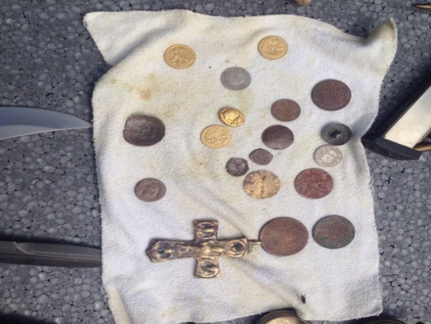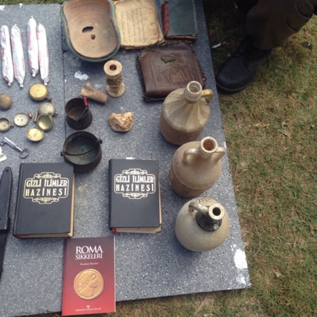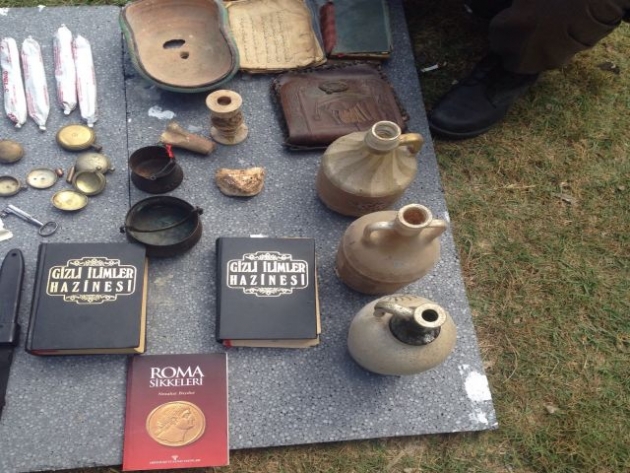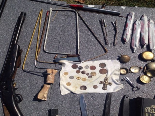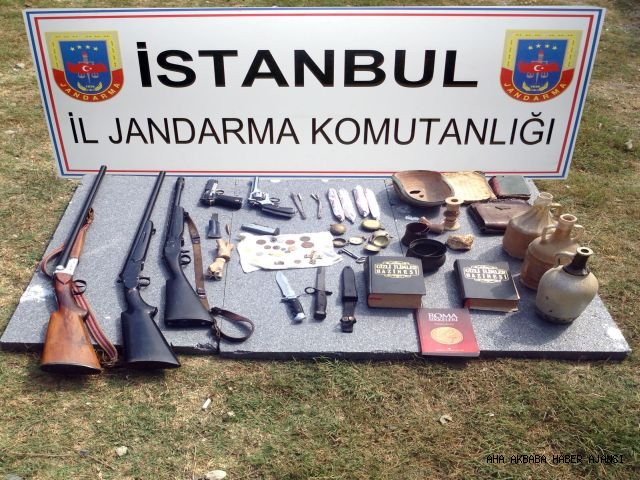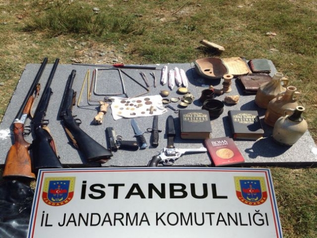 İstanbul İl Jandarma Komutanlığı ekiplerince şüpheli şahsın yakalanması ile suç ve suçta kullanılan malzemelerin ele geçirilmesi maksadıyla Çatalca Cumhuriyet Başsavcılığından alınan arama kararına istinaden şüpheliye ait eve yapılan operasyon neticesinde (Y.Ü.) isimli şüpheli şahıs ile birlikte 3 adet av tüfeği, 1 adet kurusıkı tabanca, 1 adet tabanca, 2 adet 20 cm. uzunluğunda bıçak, 18 adet bakır sikke, 1 adet yaklaşık 10 cm. uzunluğunda haç, 5 adet sarı köstekli saat dış kabı, 1 adet eski cezve tarız ev eşyası, 1 adet kulplu küçük eski tas, 3 adet cam şişe, 2 adet fünye, 4 adet dinamit lokumu, 1 adet topraktan yapılmış kırık tabak, 3 adet parçalanmış halde Arapça yazılı kitap, 1 adet deri kitap çantası, 3 adet kilden yapılmış parça, 7 adet muhtelif kazı malzemesi ele geçirilmiştir.